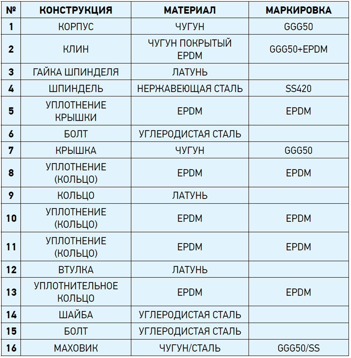 - КЛИН: чугун GGG50 покрытый EPDM, возможны другие варианты исполнения